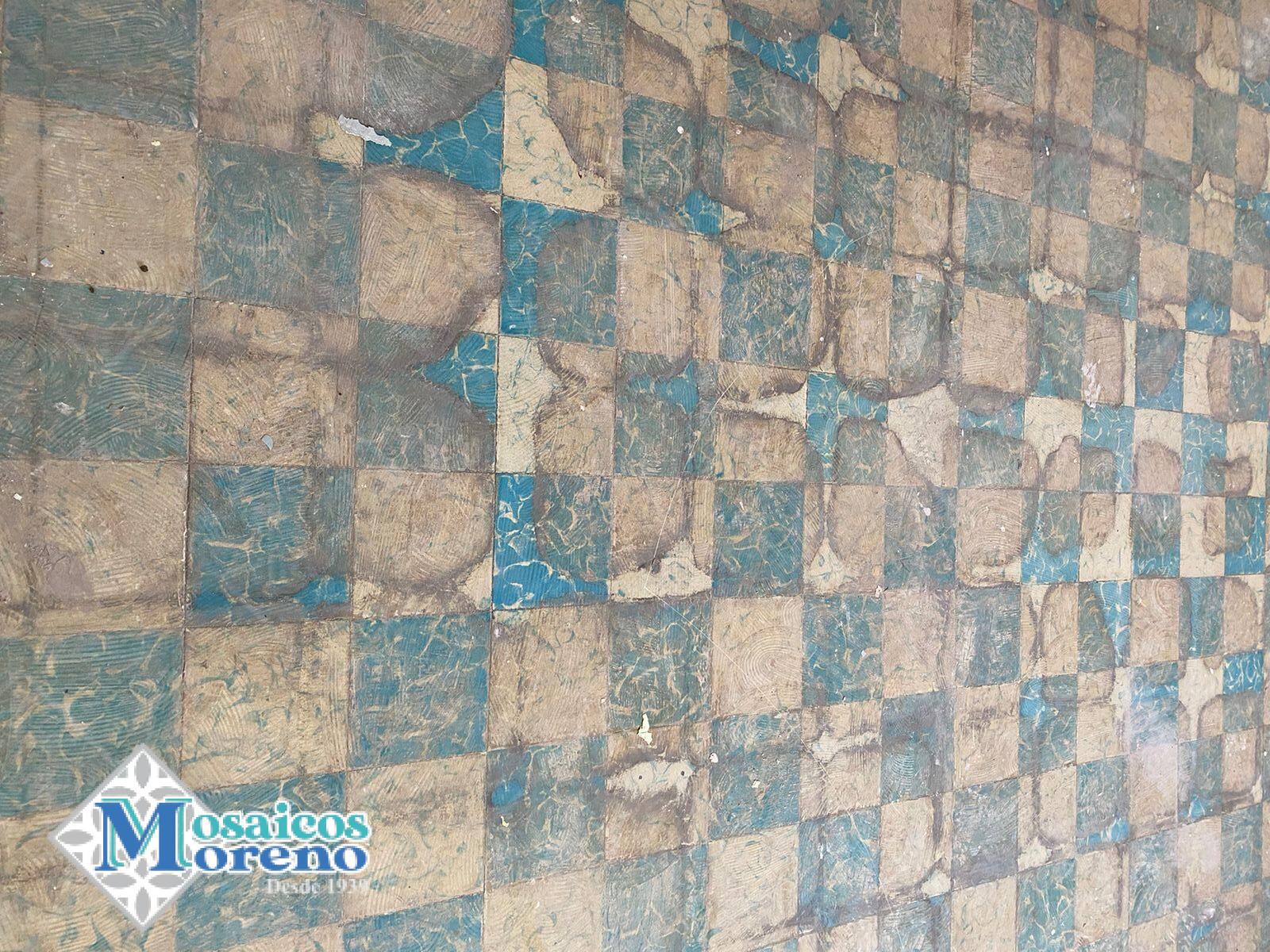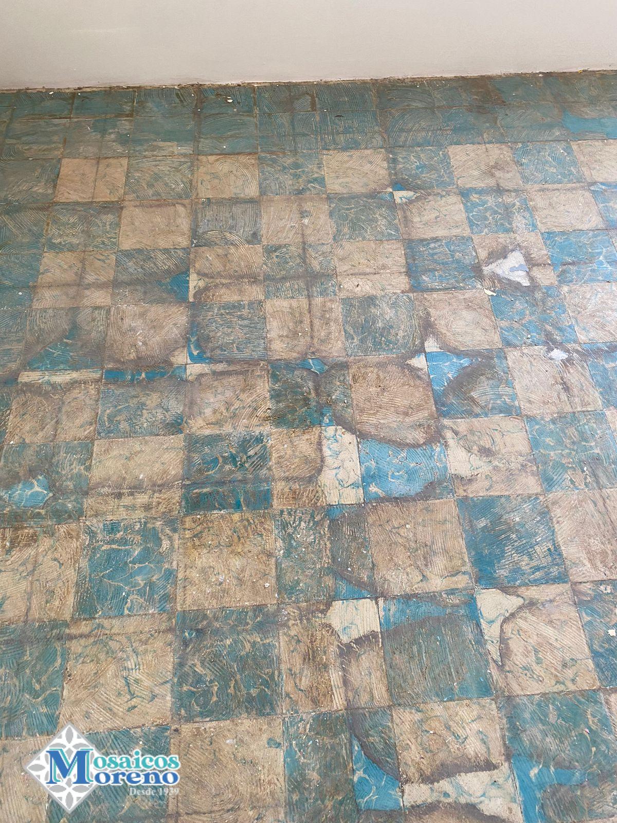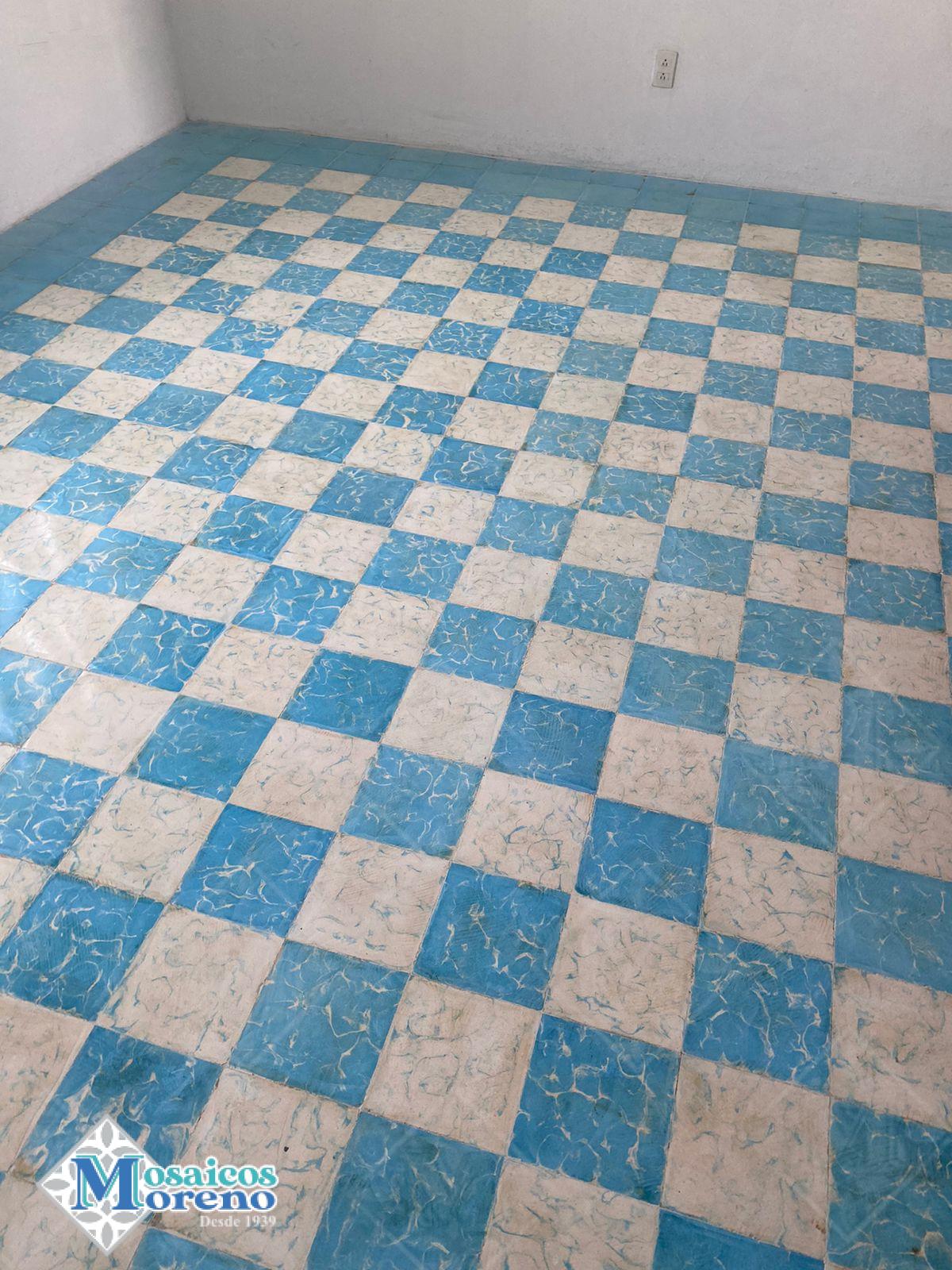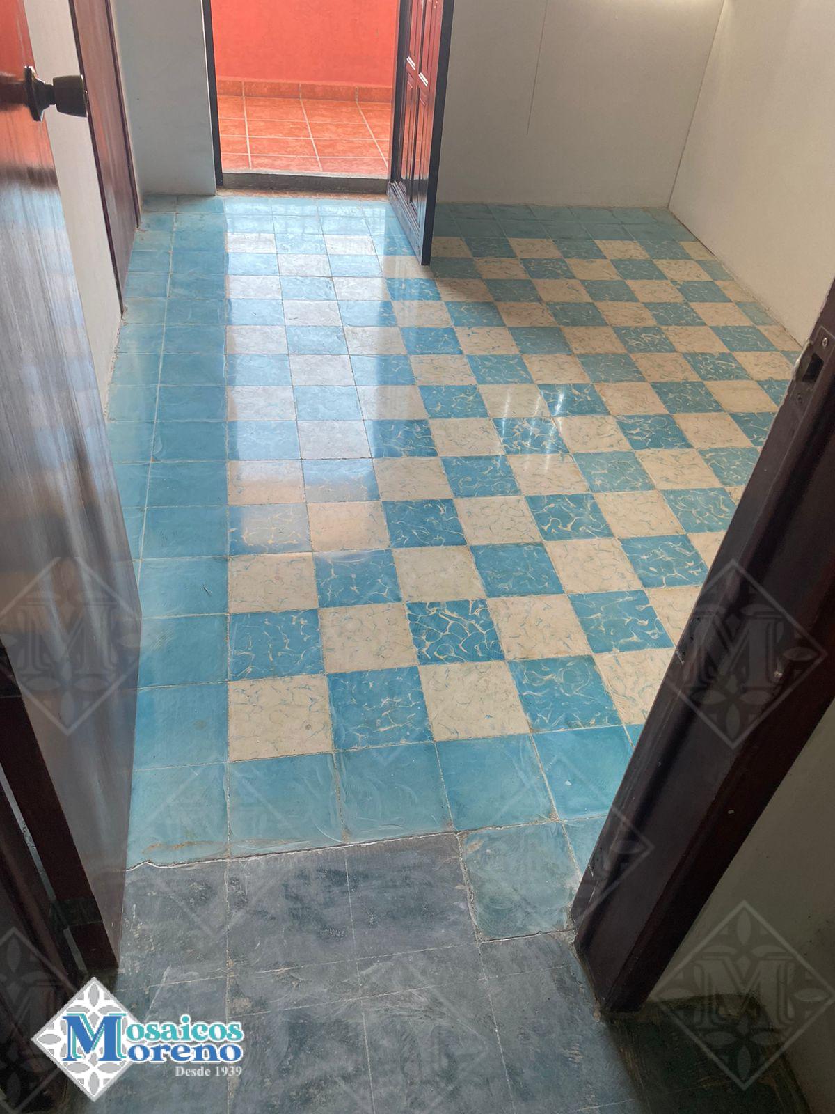 En 1979 se instaló piso de Mosaicos Moreno, loseta de pasta de cemento 20 X 20 tipo tablero a dos colores azul marmolaedo y blanco marmolaedo, con guarda en azul liso.